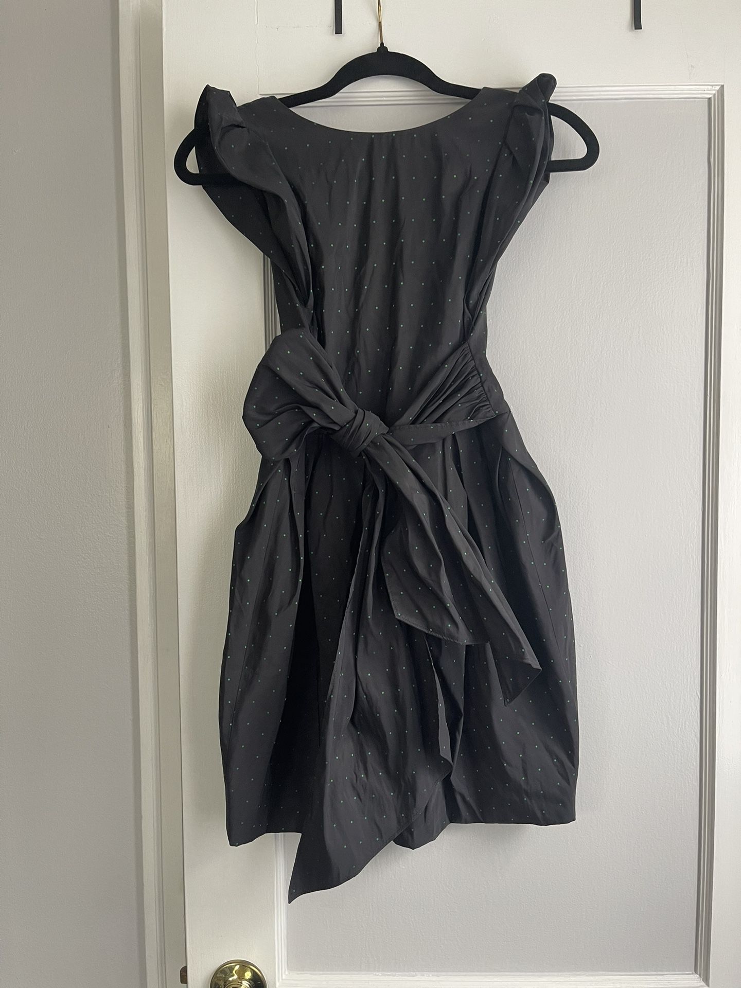 Elegant black FRAY I.D dress with subtle green polka dots and long side ties. Features a flattering ruched waist, cap sleeves, and flowy side panels for a modern, feminine silhouette. Fully lined with a hidden side zipper. In excellent condition — beautiful quality and made with FRAY I.D’s signature minimalist Japanese design.