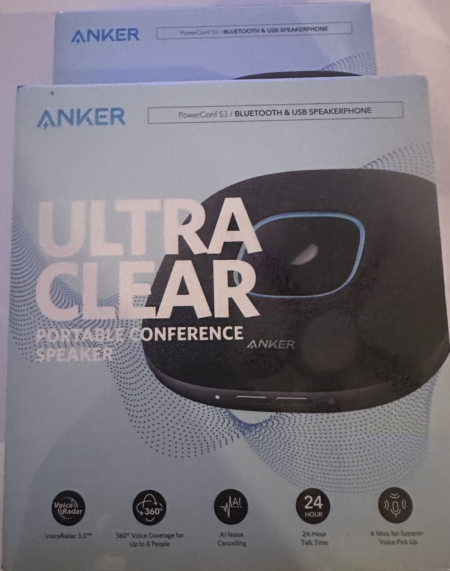 Brand new. Never used. In box. Unopened. No damage. No issues‼️🔥 Only 2 available‼️🔥 Product details Top highlights positive aspect Everyone heard clearly with AI voice balancing technology positive aspect Lasts all week of meetings with 24-hour battery life positive aspect Connects to all major meeting apps without extra setup Summarized from product information Rufus AI 360° Coverage: 6 microphones arranged in a 360° array pick up voices from all directions to instantly transform any space at home or the office into a meeting room. Voice Radar 3.0 Technology: Powered by AI deep learning capabilities to reduce noise, cancel echo, and detect multiple speakers. Optimized Clarity and Volume: Your voice is automatically balanced to make up for differences in volume and distance from the Bluetooth speakerphone. Perfect For Home Offices: Connect to your phone via Bluetooth or to your computer with a USB-C cable—without needing to install drivers. PowerConf Bluetooth speakerphone is Zoom certified and is compatible with all popular online conferencing platforms. 24 Hours of Call Time: A built-in 5,200mAh battery gives you the option to go wireless and hold meetings virtually anywhere. Integrated Anker PowerIQ technology allows you to charge other devices via PowerConf at optimized speeds.