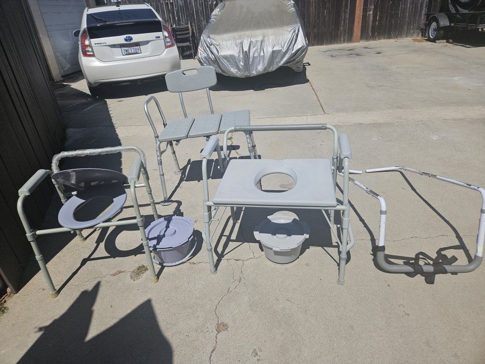 The first pic is a shower chair, its clean like new asking $10 Second pic is toilet chair its brand new asking $20 comes with bucket Third pic is a toilet seat to,they both go over toilet or u can use the bucket, its very clean asking $10 Last is a bed frame handle it goes between the mattresses for a better grip, its like new hardky used, asking $15