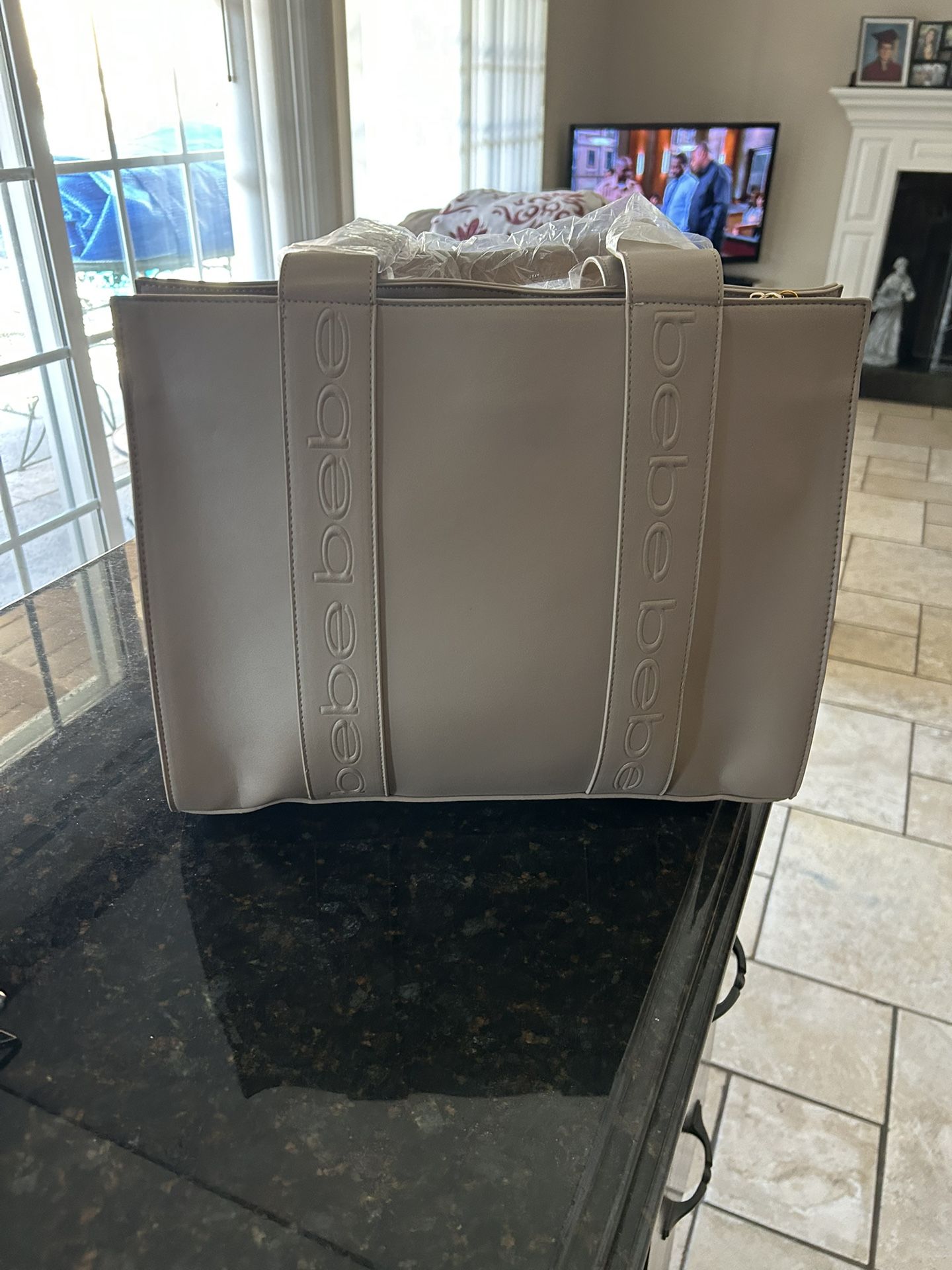 New Bebe Tote Bag Beige Great Gift 16” wide x 12” height 16” wide x 21” height with handles MSRP $129 asking $40 or best offer
