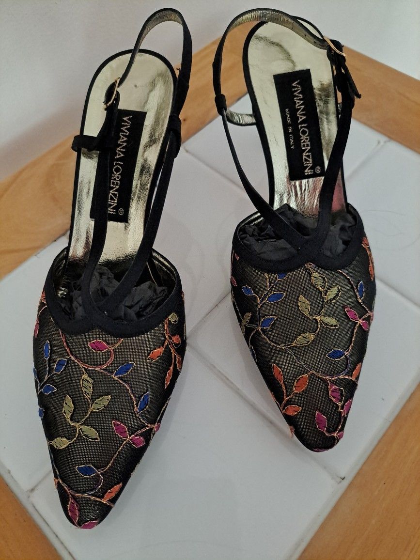 Designer Viviana Lorenzini Multicolor Floral Black Slimg Back Heels Sz 7.5