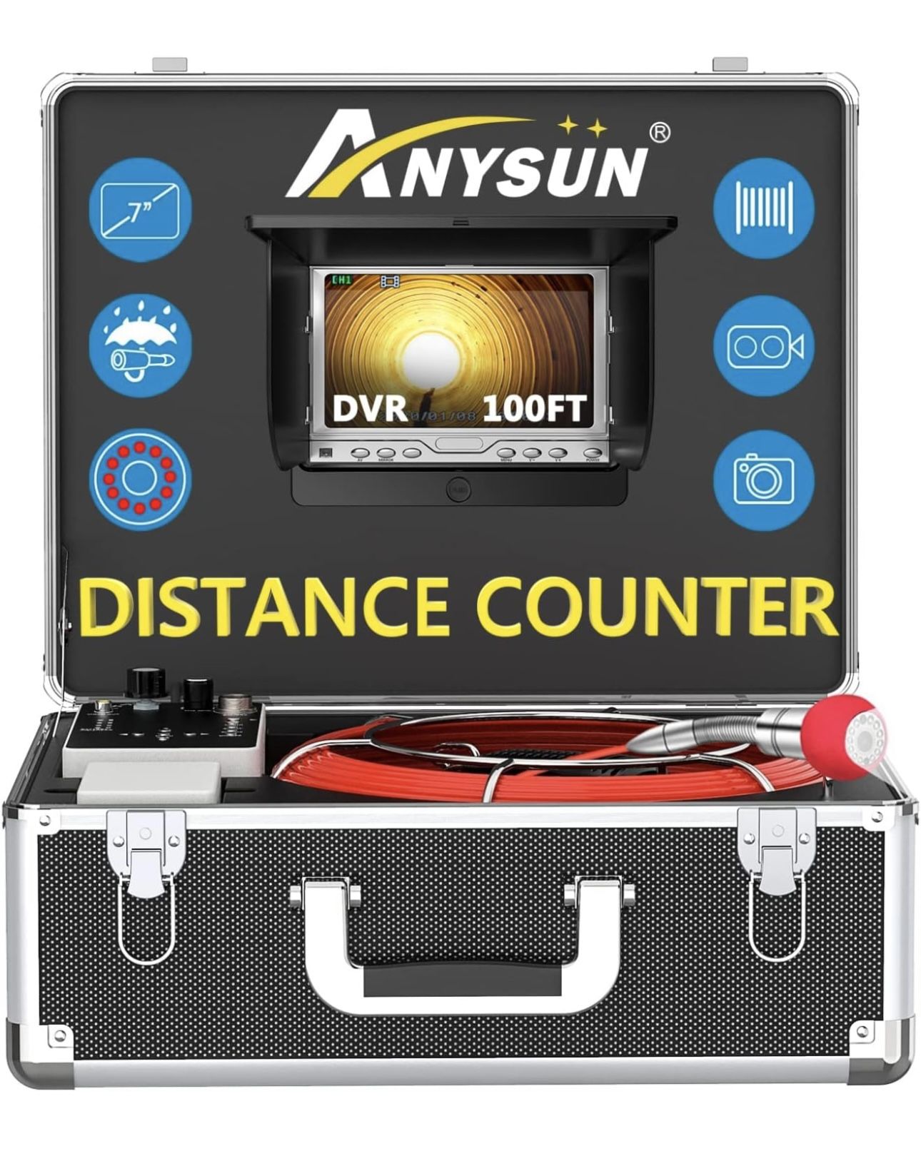 Anysun Sewer Camera 100ft Snake Cam with Distance Counter DVR Video Sewer Pipe Inspection Equipment 7 inch LCD Monitor Duct HVAC 1000TVL Endoscope Wat