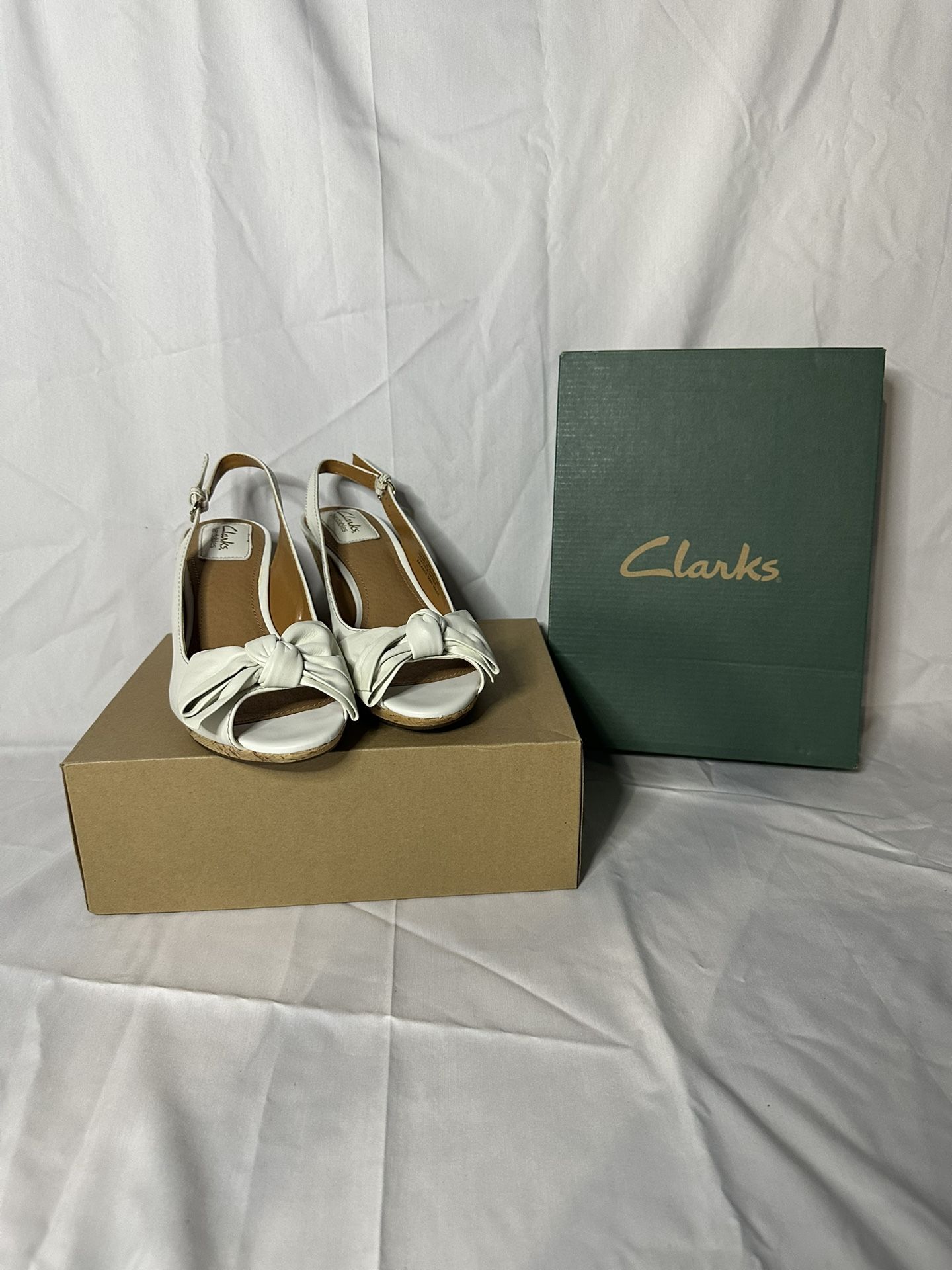 Brand new pair of Clarks Bendables Fiddle Bow Wedge in women's 7.5. White leather upper with the little bow detail on the front and a flexible Bendables sole that makes them super comfortable. Clean, classic look and easy to wear with pretty much anything. Never worn.