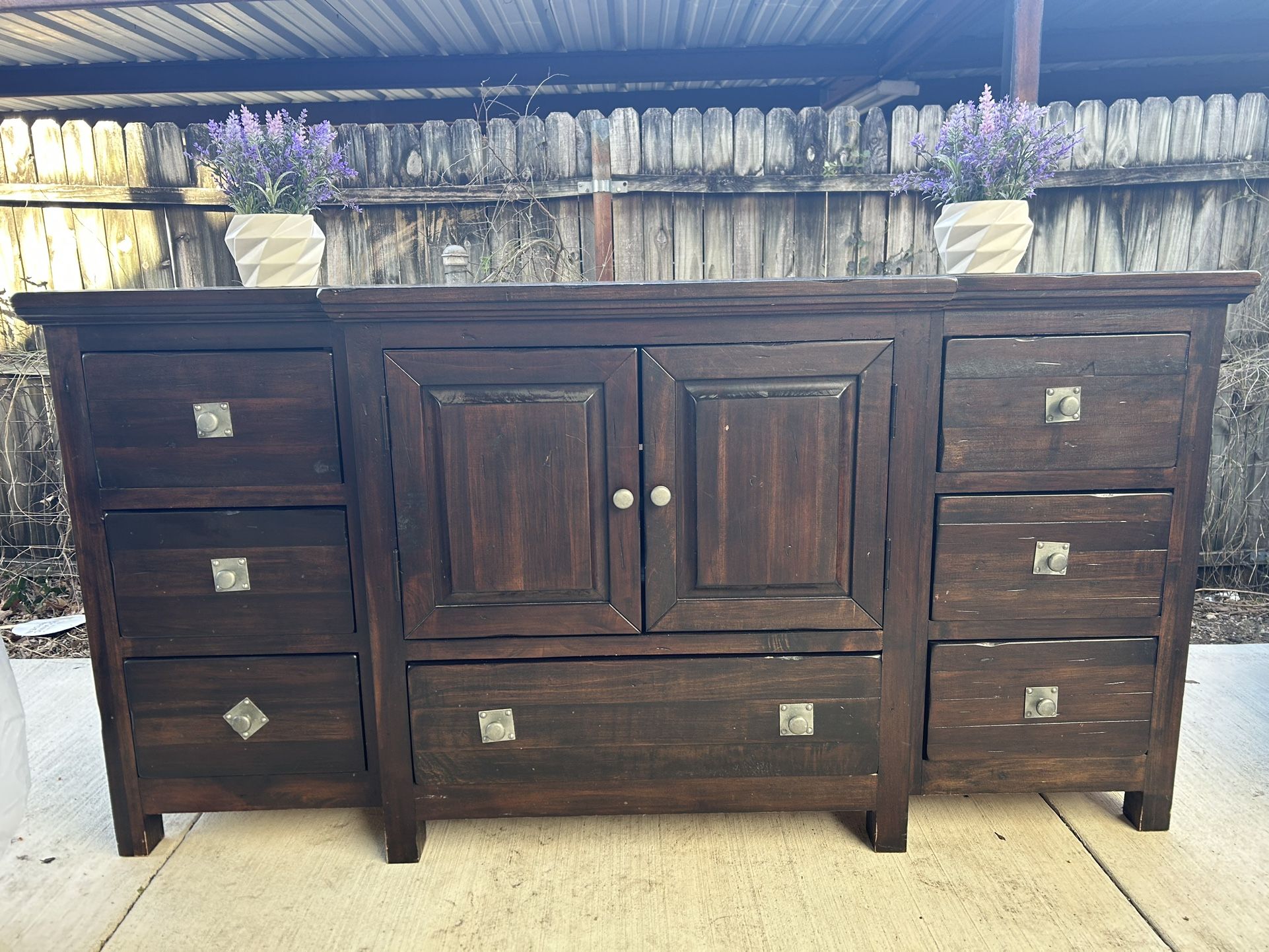 Pick up in the north side of Fort Worth, 76164. Delivery available for a fee. This preowned triple dresser/buffet is in great condition. It will add great storage space to your master bedroom, while contributing a calm and casual look. Clean lines and a rustic charm make this simple dresser with weathered wood finish a stand-out option for your home. Plenty of storage drawers and cabinets. Constructed of solid wood. Dimensions 71” wide x 21” depth x 36” tall. SKU SKU:1133-207 Checkout my other great listings!