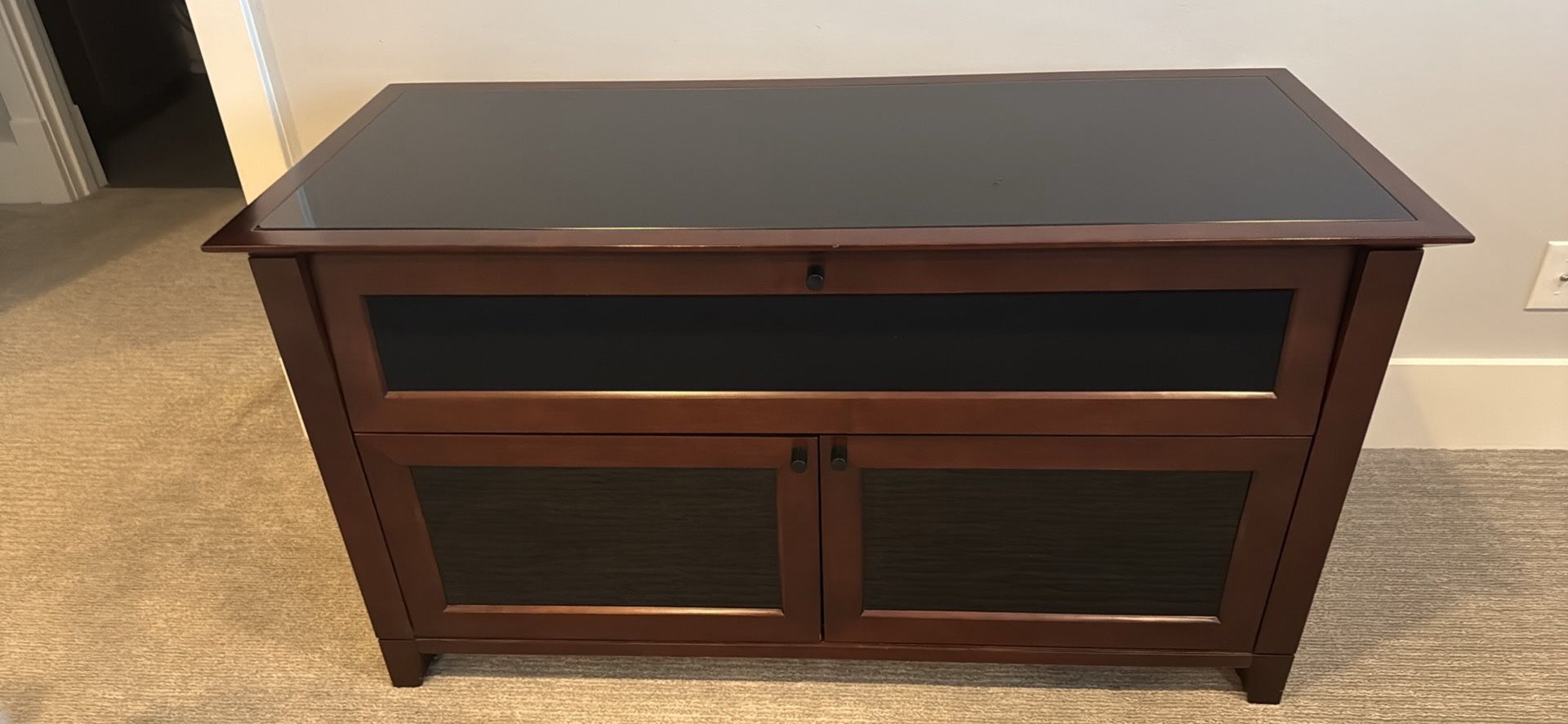 Solid Wood and Smoked Glass media cabinet. 52” wide 22” deep and 28 1/2” tall. Price negotiable - Will trade for round 30” wood coffee table.