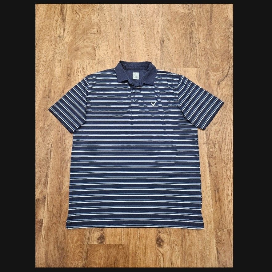 This is a Callaway Opti-Dri polo shirt featuring a classic navy blue and white stripe pattern. Made with moisture-wicking fabric, it is designed for comfort and style on and off the golf course.