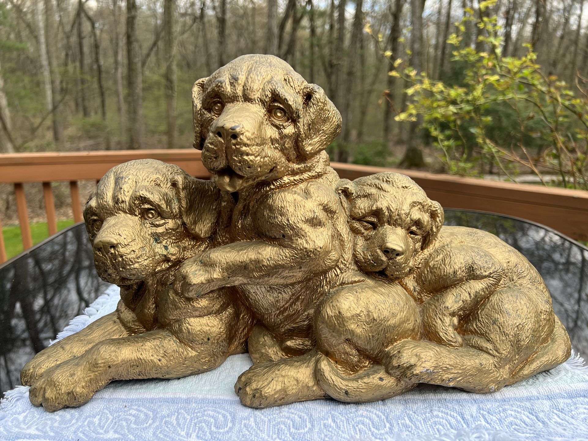 Precious Pre Owned Large Three Gold Puppies Cuddled Together Ceramic Sculpture. Each puppy is adorable. Measures approximately 16.5” X 8” X 9.5” & weighs 14lbs, 8oz Please review all photos as they are part of the description. Noted: small chips. Not sure if it has discoloration or it is part of the finish with the dark spots. This is a pre owned item. As such, may have minor flaws from normal use.