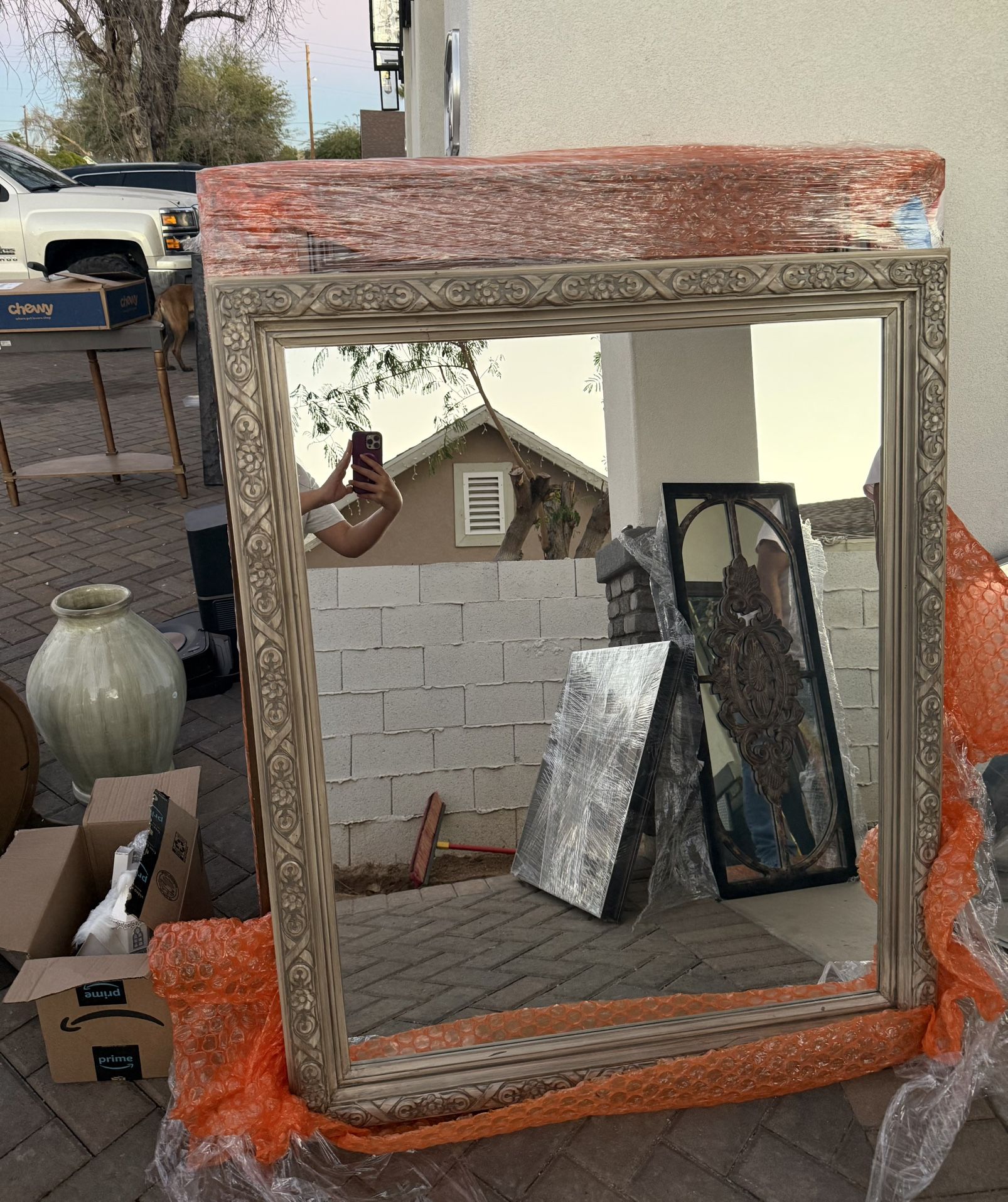 Large antique style mirror with carved wood frame. Solid, elegant, and decorative piece. Great for home or business use. Very good condition. Dimensions: 40" wide x approx. 49-50" tall Price: $180 Espejo grande estilo antiguo con marco de madera tallada. Pieza sólida, elegante y decorativa. Ideal para casa o negocio. En muy buen estado. Medidas: 40" de ancho x aprox. 49-50" de alto Precio: $180