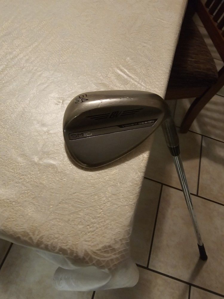 This is a right handed Titleist SM10 golf club 54 degree wedge with a steel wedge flex shaft. Titleist Vokey Design SM10 Wedge Unlock your ultimate short game potential with the Titleist Vokey Design SM10 Wedge. Crafted with tour-proven grinds and precision-engineered Spin Milled grooves, this wedge offers unparalleled control and versatility. Elevate your performance on the course with the unmatched feel and consistency that top golfers rely on. FEATURES Nothing can do more to improve your play from 100 yards and in like a fresh set of grooves, especially when those grooves are Spin Milled into a Vokey Design SM10 Wedge with a grind fit to your needs. Take hold of Vokey Design's most advanced design, played by the best wedge players in the world, and see exactly how sharp your wedge game can be. Get lower, more attacking flight in a wedge that feels amazingly solid at impact with SM10. A precise shift in the center of gravity gives you even more control and stability for greater confidence over every shot. Every SM10 groove is cut to the edge to maximize spin. Each Vokey wedge is 100% inspected for utmost quality and performance, and a localized heat treatment is applied to the impact area to double the durability of the grooves. Original cost was $190. This is a awesome wedge!