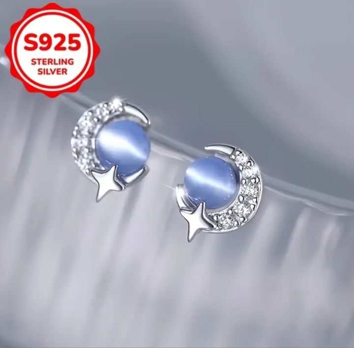 Elegant 925 sterling silver stud earrings featuring a crescent moon with star design and beautiful blue cat's eye stone centerpiece. These hypoallergenic studs measure 0.8cm/0.31inch by 0.6cm/0.24inch, making them perfect for everyday wear while still making a statement. **Key Features:** - Genuine S925 sterling silver - Blue cat's eye stone embellishment - Crescent moon and star design - Compact size (0.8cm x 0.6cm)oʻ - Hypoallergenic material - Suitable for daily and special occasions These earrings combine elegance with a celestial motif, making them an ideal gift for any occasion.
