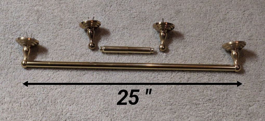 Brass Towel Rack with Matching TP Roll Holder Nice quality brass towel rack with matching toilet paper roll holder. Very good condition. The towel bar can easily be shortened, if it is too long as is. The mounting hardware is included.