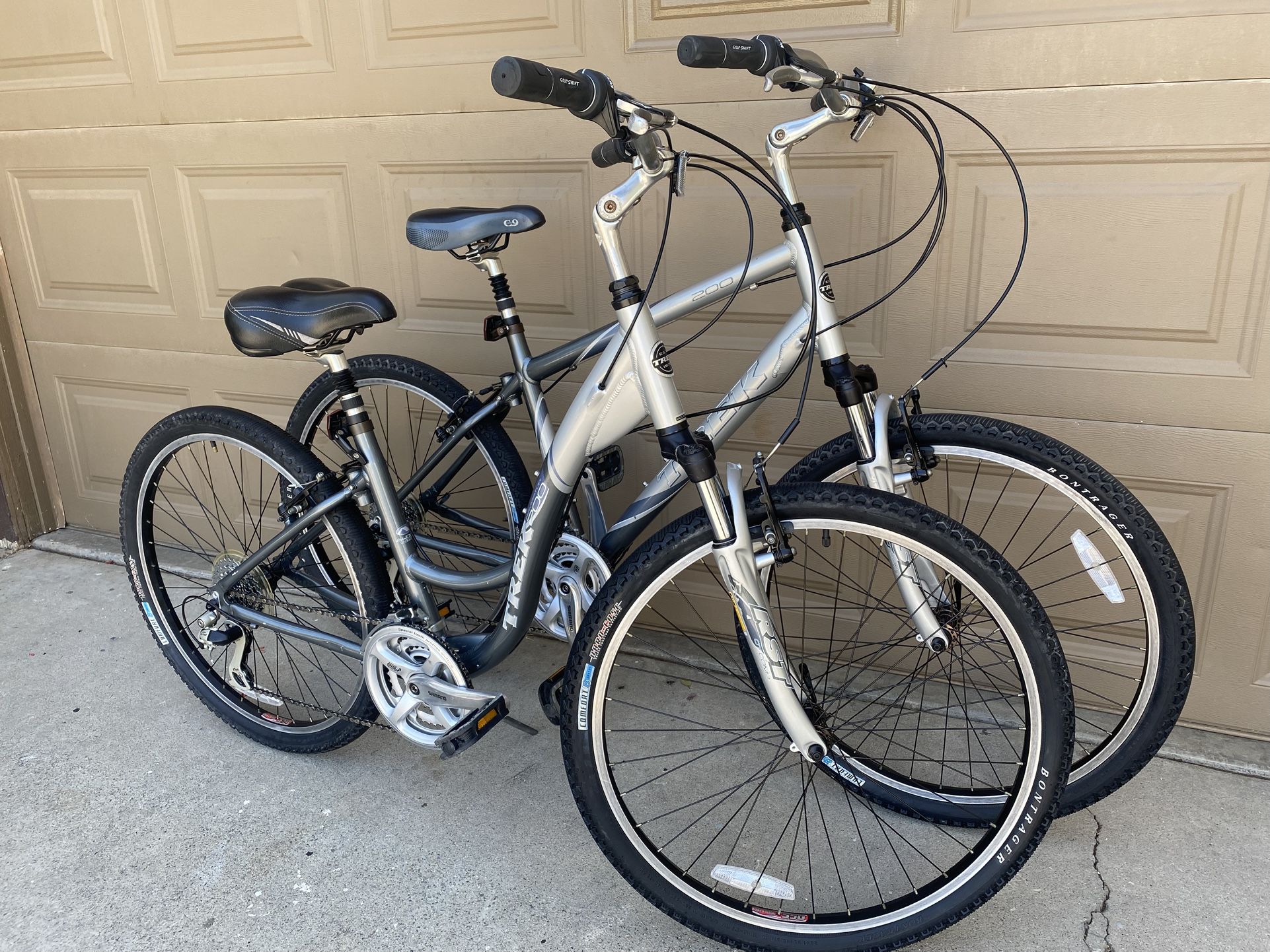 They’re in very good condition. Front suspension, 24 speed, 26”. Quick release wheels , kickstand, shimano components . Asking $250 each or $400 for both.