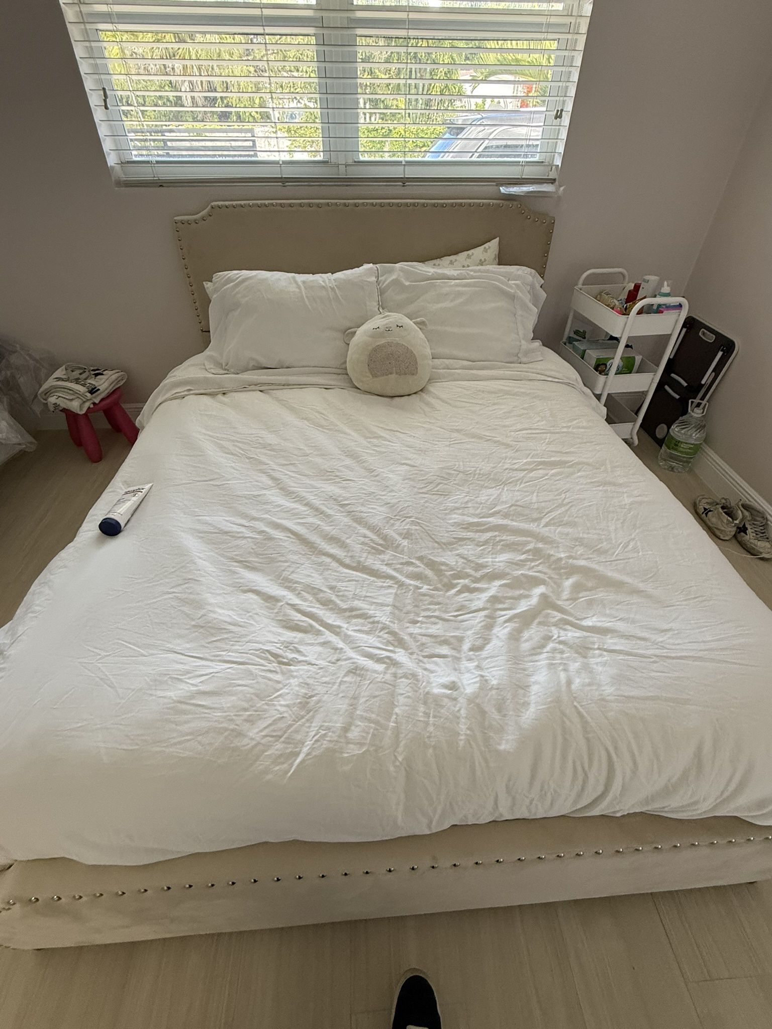 Beige , Velvet upholstered bed with 4 drawers( has decorative studs in headboard and footboard. In box. Decided to go with another look. Bought for $284.99 / not used