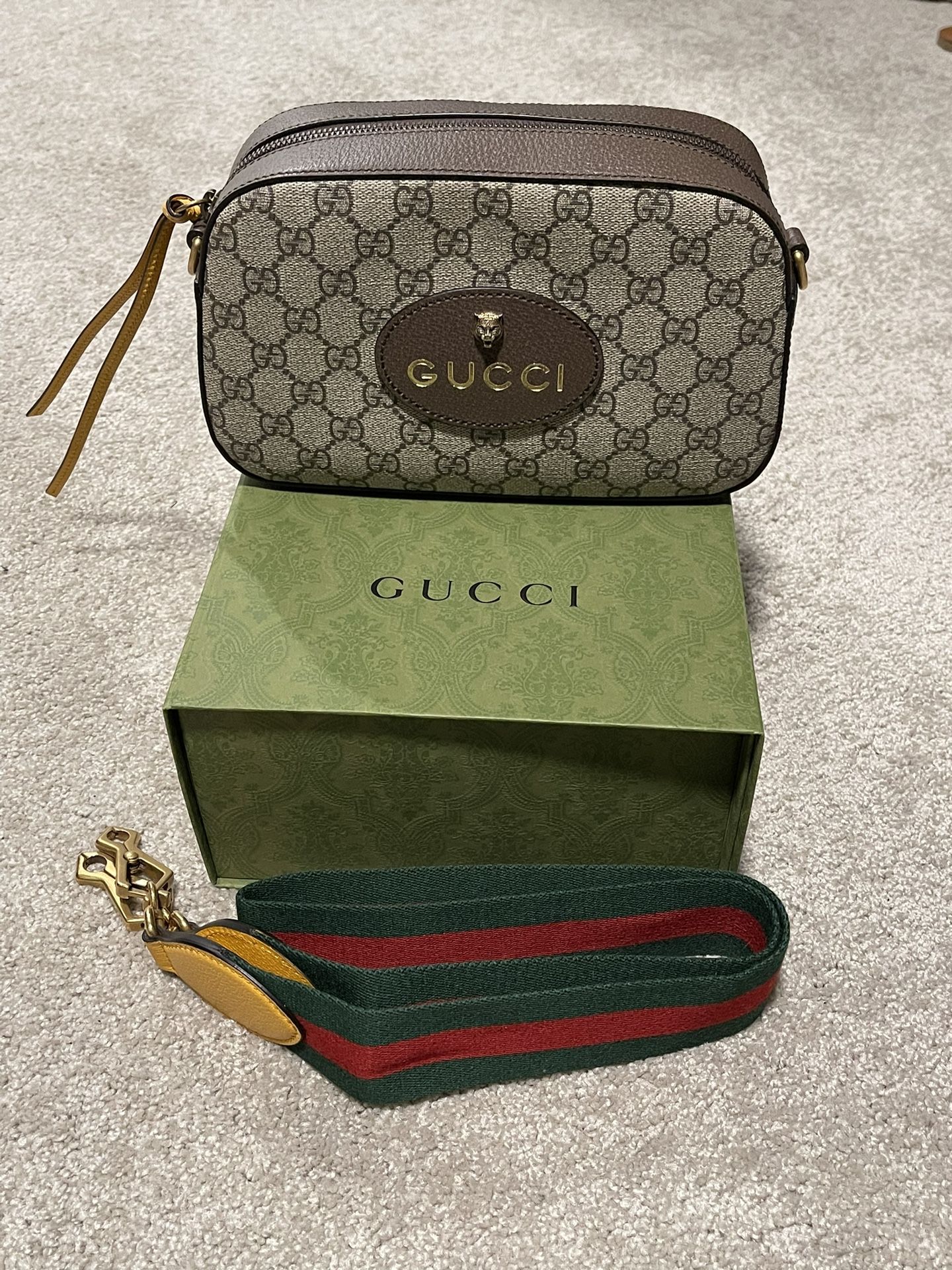 This is authentic Gucci! Worn once for pictures, excellent condition. No imperfections. Everything included, pad coverings for brass hardware on the straps, dust bag, info cards, tags and original box. DM if you need more photos or have questions! Beige/ebony GG Supreme canvas Brown and yellow leather trims Brass hardware Oval Gucci leather tag with skull Interior open pocket Shoulder strap with 50 cm drop Zipper closure Measurements 9.5” W x 6” H x 3” D