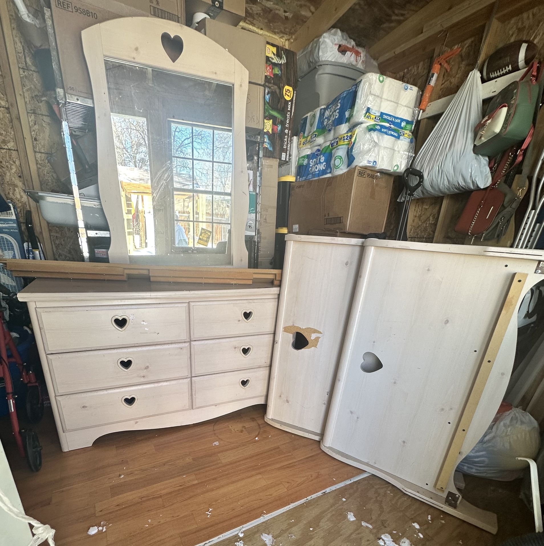 Twin bed set for girls. Has some flaws as seen in pictures. No mattress. Good for someone needing something budget friendly or looking to refinish as project. Free to ask more questions