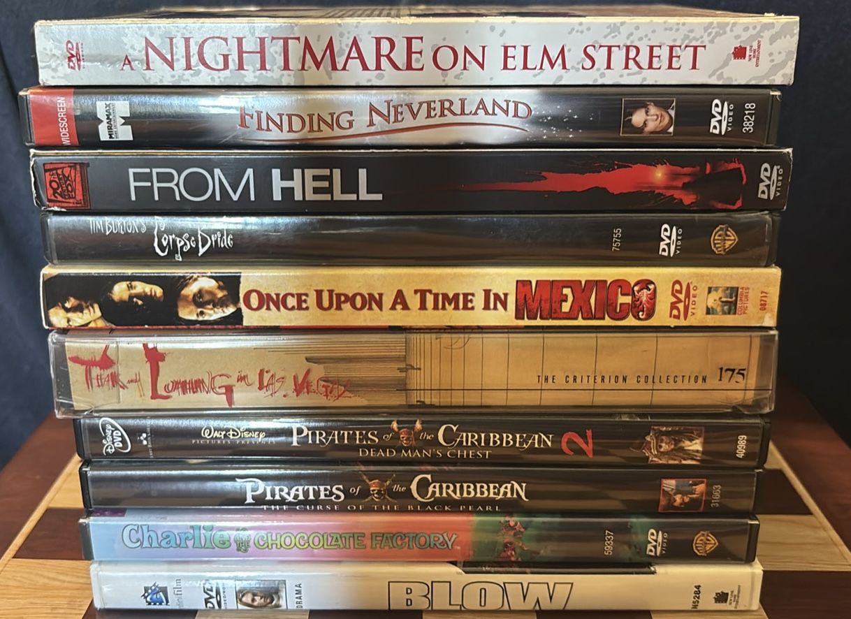 Awesome collection of DVDs here! Got a mix of movies, many starring Johnny Depp. Includes A Nightmare on Elm Street, Finding Neverland, From Hell, Corpse Bride, Once Upon a Time in Mexico, Fear and Loathing in Las Vegas (Criterion Collection), Pirates of the Caribbean Dead Man's Chest, Pirates of the Caribbean Curse of the Black Pearl, Charlie and the Chocolate Factory, and Blow. Also has the complete first season of 21 Jump Street. Cases are in good shape, some have minor shelf wear. Fun movies for watching!