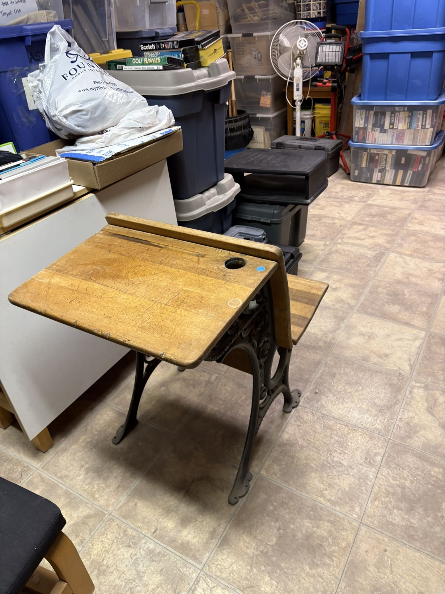 Antique school desk with built-in seat iron rod sides in pretty good condition.