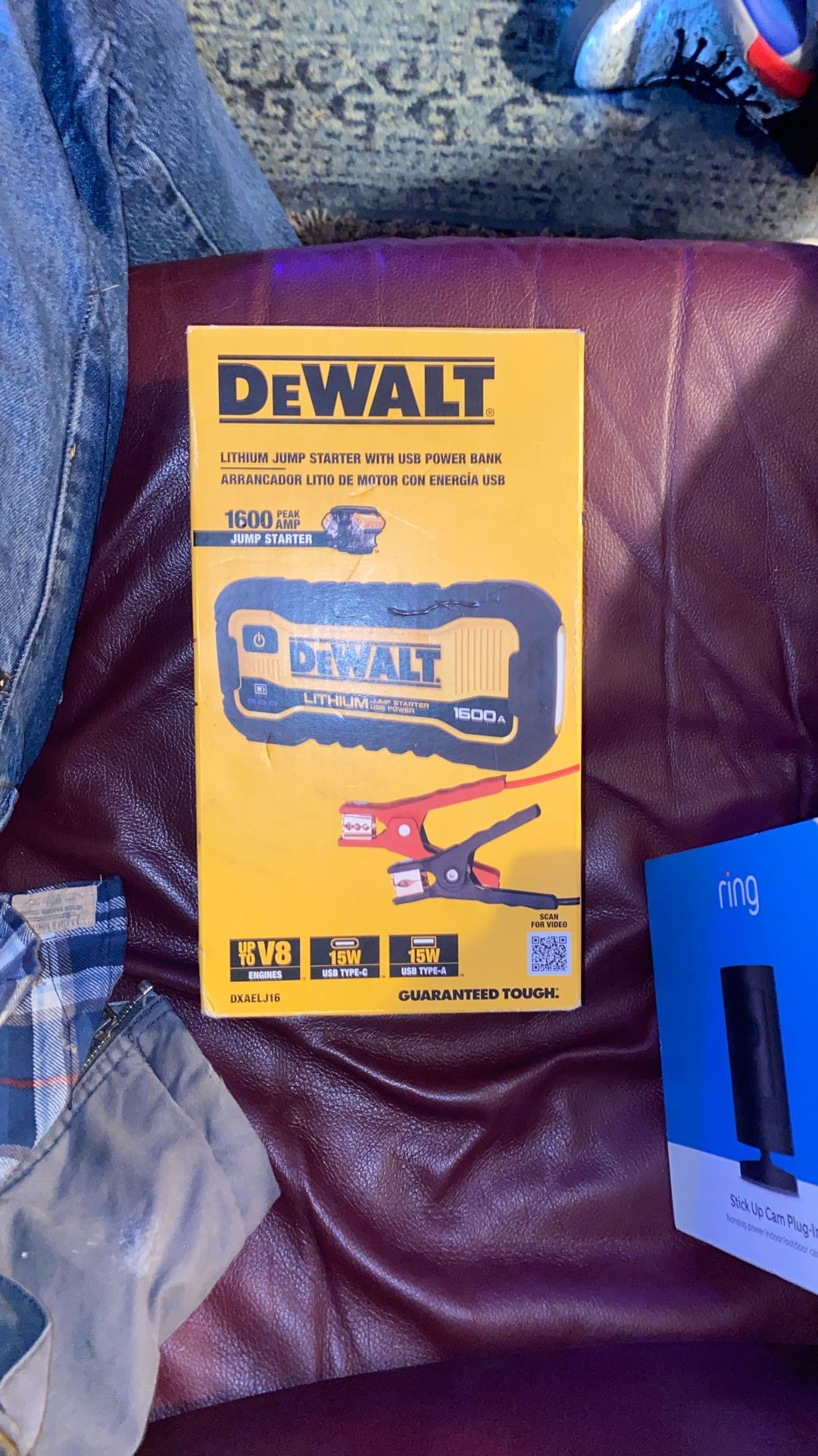 Dewalt 1600 Amp Lithium Jump Starter W/USB Power Bank About This Product: The DEWALT 1600 Peak Amp Lithium Jump Starter, DXAELJ16 is a portable jump starter and USB power bank in a small take-along size. 1600 peak amps of starting power instantly jump starts cars and trucks up to 8-cylinders. Charge up the internal battery and get up to 35 jump starts. Powder-coated metal clamps are included. The reverse polarity protection assures that jumper cables are connected correctly. The mini powerpack features both 3.1A USB-A & USB-C charging ports and a fully charged battery can charge up a tablet, 19 AirPods, 2 smart phones, 25 smart watches, 6 cameras, etc. (Based on internal testing and may vary depending on multiple factors such as storage conditions and frequency of use.) The bright LED light helps with repairs after dark. 1-year warranty. 1600 peak amps of starting power instantly jump starts cars and trucks up to 8-cylinders Charge and power your tablets, phones, gaming devices and more on the go Includes AC, DC and USB adapters to help you recharge the lithium battery from practically anywhere, also includes a carry bag Reverse polarity protection to assure that jumper cables are connected correctly Compact sized, this jump starter is easily stored for power when you need it Bright LED work light helps with roadside repairs after dark Rechargeable lithium battery charges up in as little as 5 hours and keeps a charge up to 6 months Always connect the 120V AC/USB Charging Adapter to the 120 Volt AC power source (using the USB Charging Cable) BEFORE connecting it to the unit.