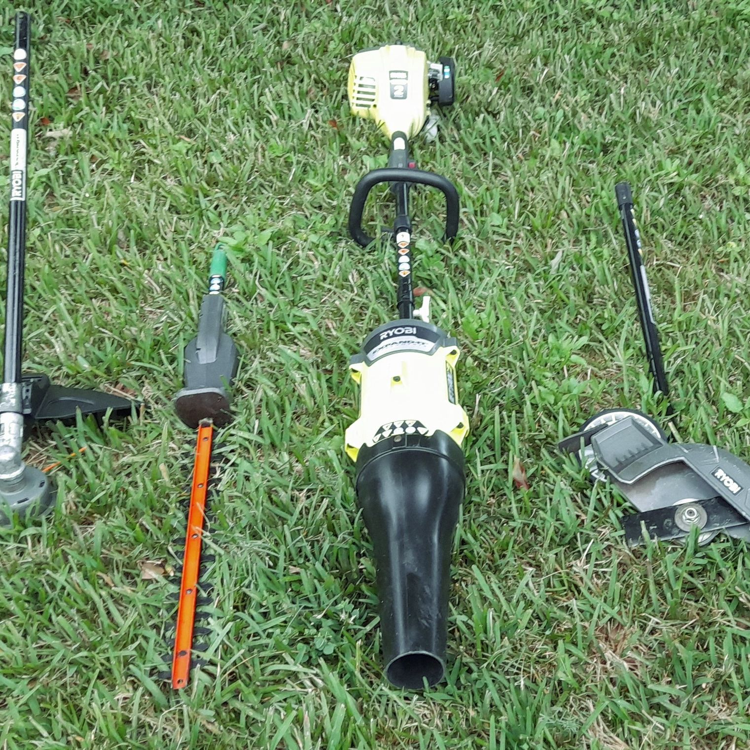 Ryobi power head with attachments. Low hours, runs 100% perfect. Includes string trimmer, edger, high output blower, hedge trimmer.
