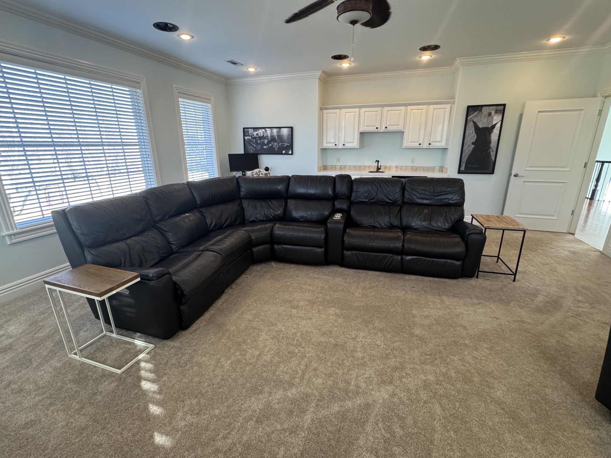 Breaks out into 7 section, 3 are recliners. Comes with rechargeable batteries if you do not have a floor plug. Must be picked up by Thursday 2/5.