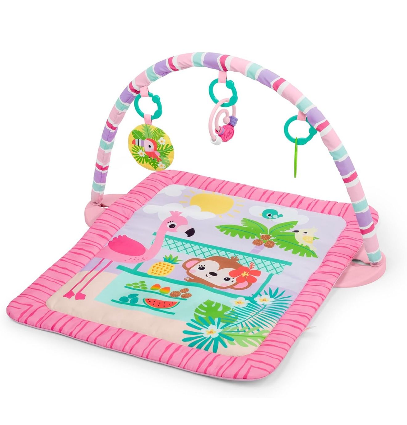 Bright Starts Pink Palms Tiki-Toy Bar Baby Activity Gym & Tummy Time Mat with-Toy Bar and 3 Toys, Newborn to 3 Years