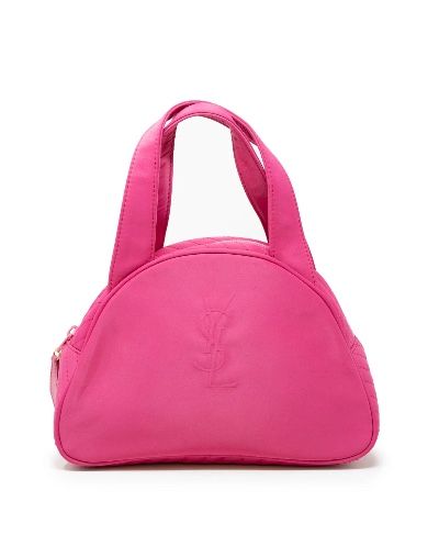 Yves Saint Laurent YSL logo mini hand bag, in smooth hot pink nylon canvas. YSL logo at front face, dual flat handles, zip closure at top opening to black woven interior, singe slip pocket to interior wall, bag: measurements for shipping purposes only - approx: 6.5"h, 9.5"w, 4"d, .5lbs In great condition. No exposed piping.