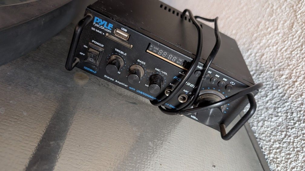 Pyle amplifier with speakers $50 for all. I had it on my porch. Don't use it any more. Bluetooth, FM and SD slot. It was nice to have music with a family reunion. .