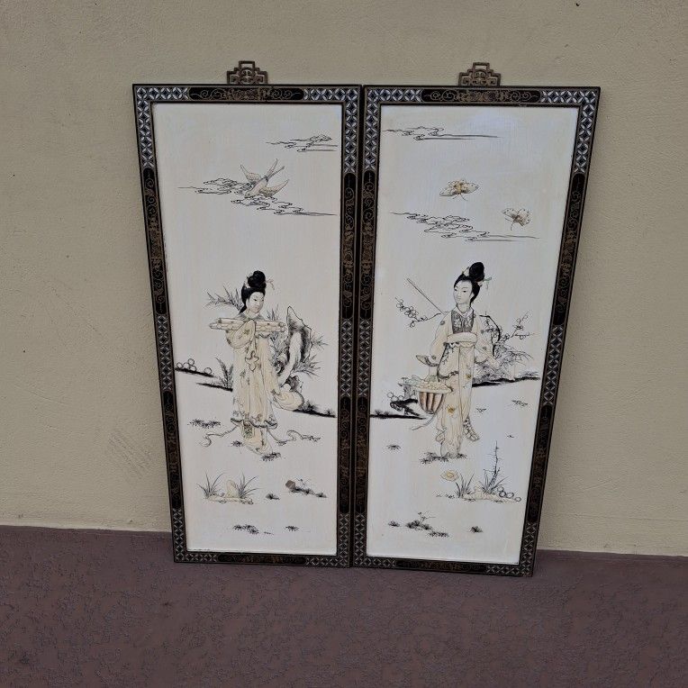 Vintage Set Of 2 Gorgeous Oriental Mother Of Pearl Relief Panels 36 X 12 Overall Size 36 X 24 Price Is For Both