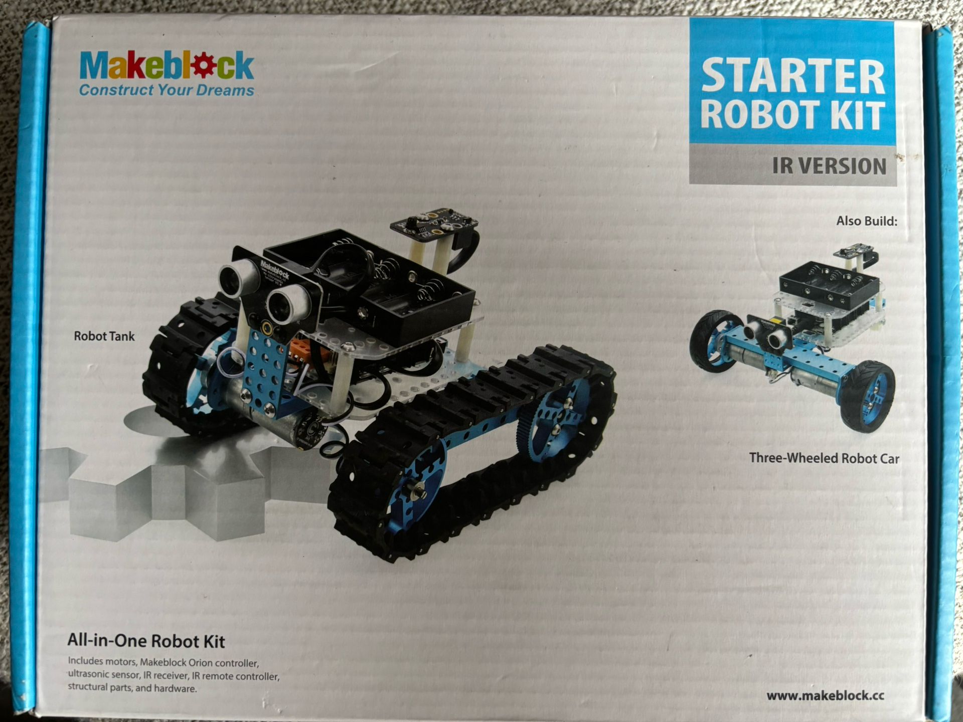 New in box, factory sealed MakeBlock Starter Robot Kit — IR Version. This model is difficult to find at an affordable price.