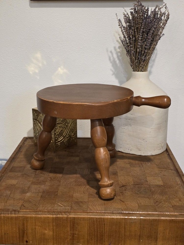 Wooden Milking Stool w/Handle 3 Three-Legged Round Seat Shows Wear