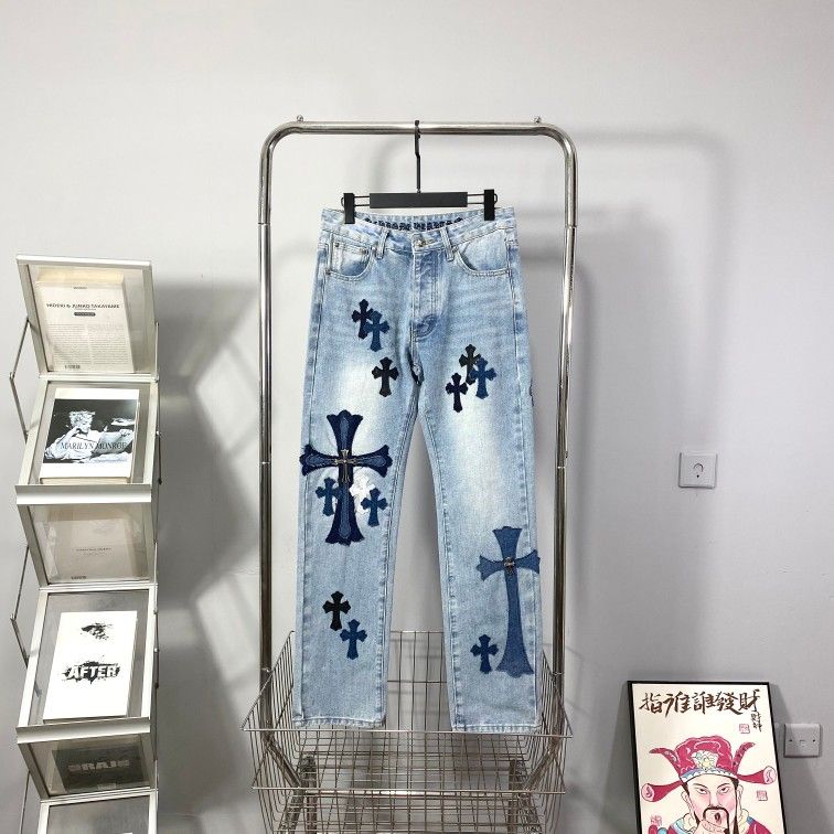 Chrome Hearts Blue Jeans Multi-Leather Label Work Jeans Brand New with Tags Color: Blue Size: 28 30 32 34 (corresponding to S-XL) Size Chart: 28 Waist 74 Pants Length 106 Hips 102 30 Waist 78 Pants Length 108 Hips 106 32 Waist 82 Pants Length 109 Hips 110 34 Waist 86 Pants Length 111 Hips 114