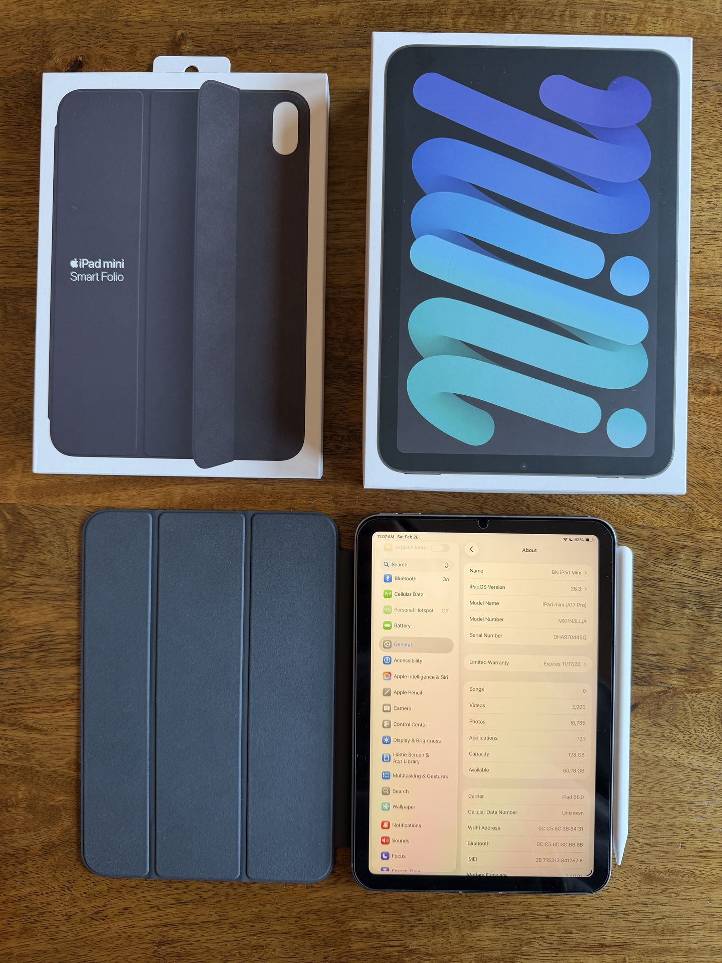 $550. Local pickup/meetup in Hyde Park, 60637. Apple A17 iPad mini (latest generation) with Apple Pencil Pro and Apple Smart Folio. This is the cellular version. The iPad is in excellent condition and has a screen protector film installed. It includes the original Apple charger and cable. Apple warranty until November 2026. Retail price is $837. I'm not considering offers or trades. I'm asking $550 FIRM.