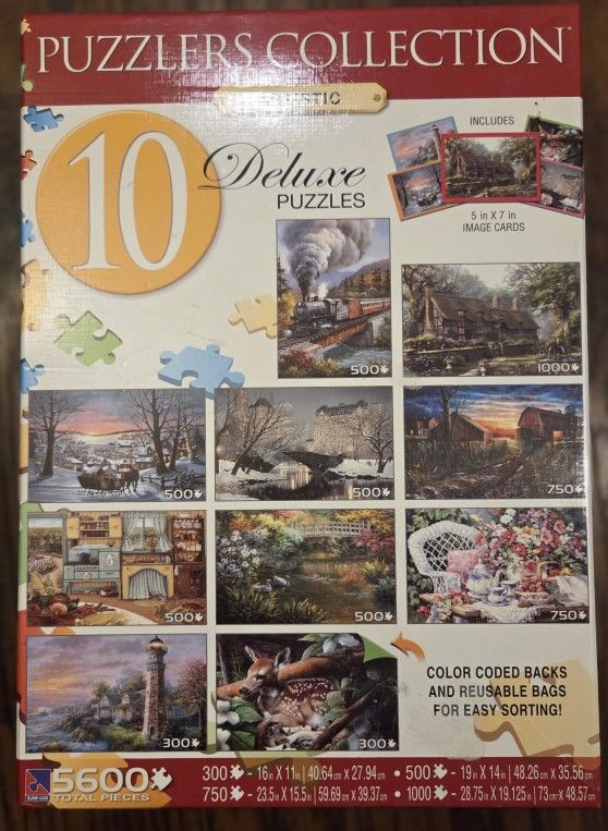 Pick up downtown Puyallup ONLY. If listed it is available. The item in the image is a Sure-Lox Puzzlers Collection set featuring 10 artistic jigsaw puzzles. Total Pieces: The set includes a total of 5600 pieces across all 10 puzzles. Variety: The collection contains puzzles with different piece counts, including 300, 500, 750, and 1000-piece puzzles. Features: The puzzles feature color-coded backs and include reusable bags for easy sorting. Inclusions: The set also includes 5x7 inch image cards for reference.