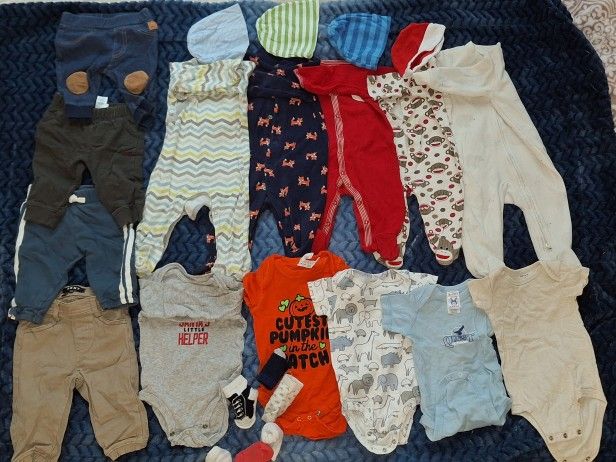 All items are in good condition Include: 5 Pajamas 4 pants 5 bodysuits 6 socks 4 hats 3 swaddles
