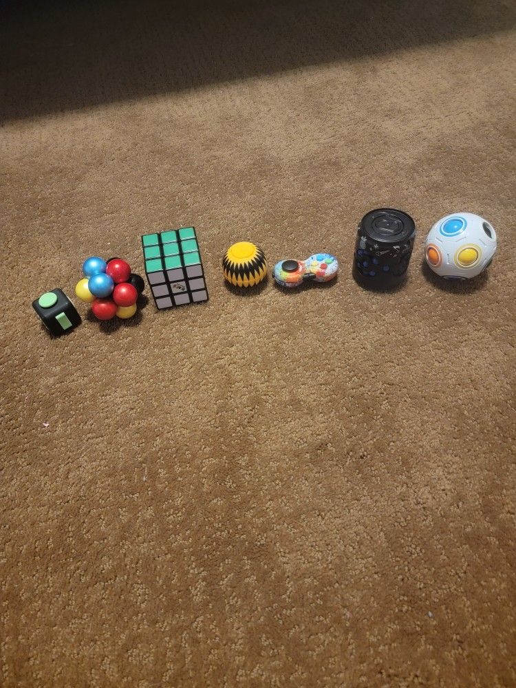 (I DO PICK UP OR SHIPPING JUST MESSAGE ME WHICH ONE) Includes: -1 fidget cube (green and black with a bunch of buttons and switches to fidget with) -1 rubik's cube (normal size 9x9) -1 DNA ball fidget thing (red, blue, yellow, and black; you move the balls around and they all have a string attached to the middle so you cant pull them off) -1 table top spinner (yellow and black; spin like fidget spinner and spin the top around just for fun) -1 game controller fidget pad (rainbow tie-dye with a bunch of buttons) -1 black sodr can with blue, red, yellow, and black circles that you can fidget with; you can move them around and move the lid and bottom of the can in circles -1 DNA ball and you push the colored balls into other holes then try to red the cor ball back in its color hole; kinda like rubik's cube)