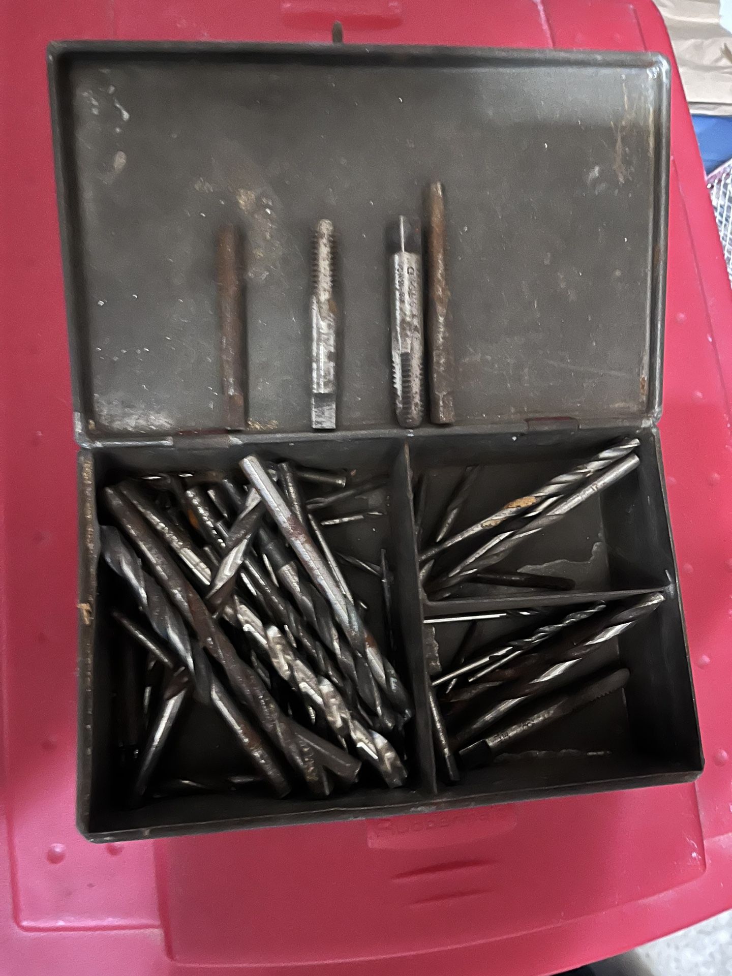 VARIOUS SIZE DRILL BITS & TAPS INCLUDES STORAGE BOX GOOD CONDITION