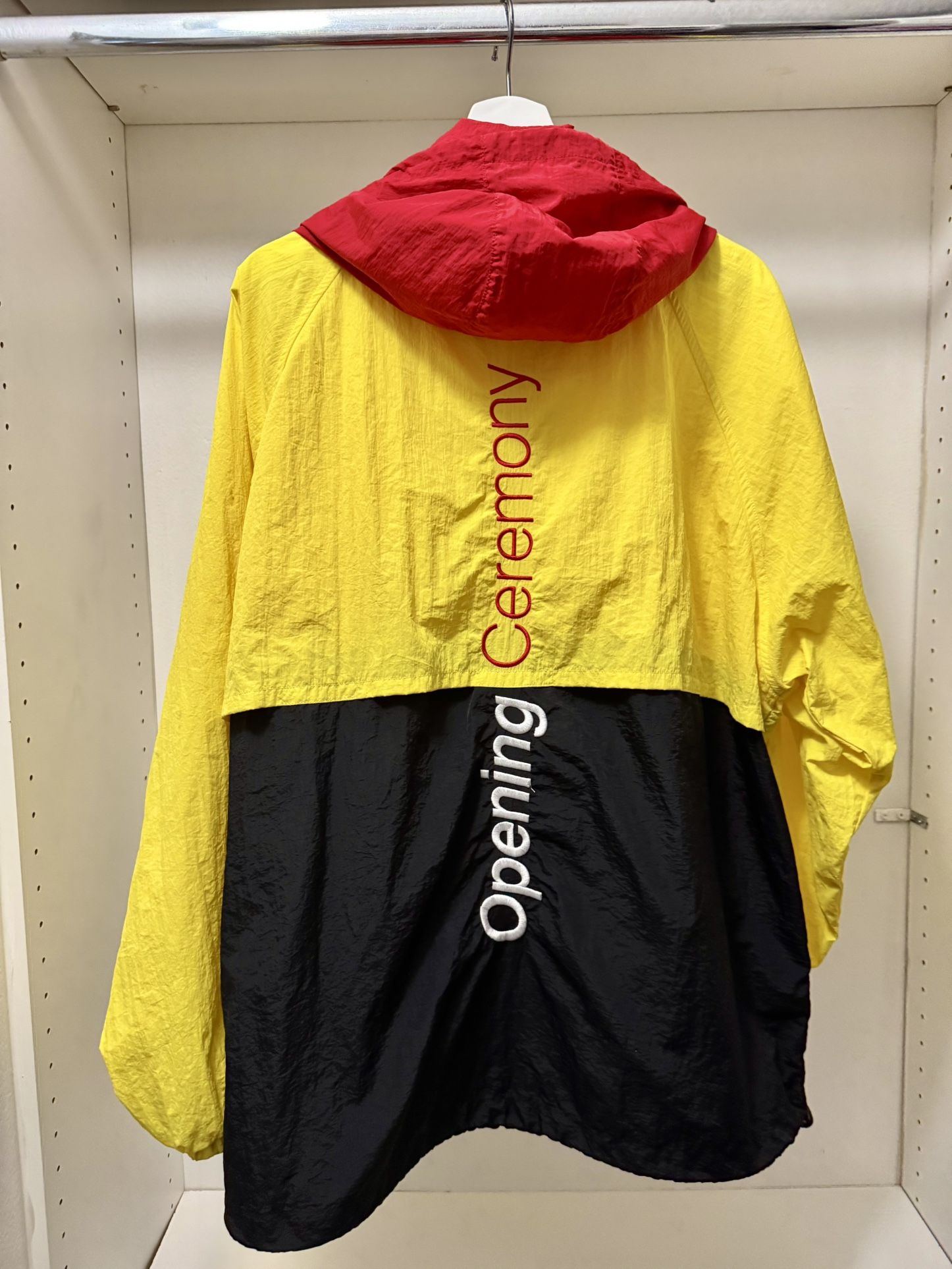 Opening Ceremony Crinkle Nylon Storm Jacket - Size XL Amazing condition Weatherproof rain jacket - keeps you completely dry in the heavy rain Red, yellow, and black color block jacket with opening ceremony text logos (embroidered and printed) Lots of pockets 100% Nylon Drawstring Hood Raglan Sleeves Zip Closure Printed Branding 2 Side Entry Zip Pockets Branded Back Embroidery Elasticated Cuffs Retail $295