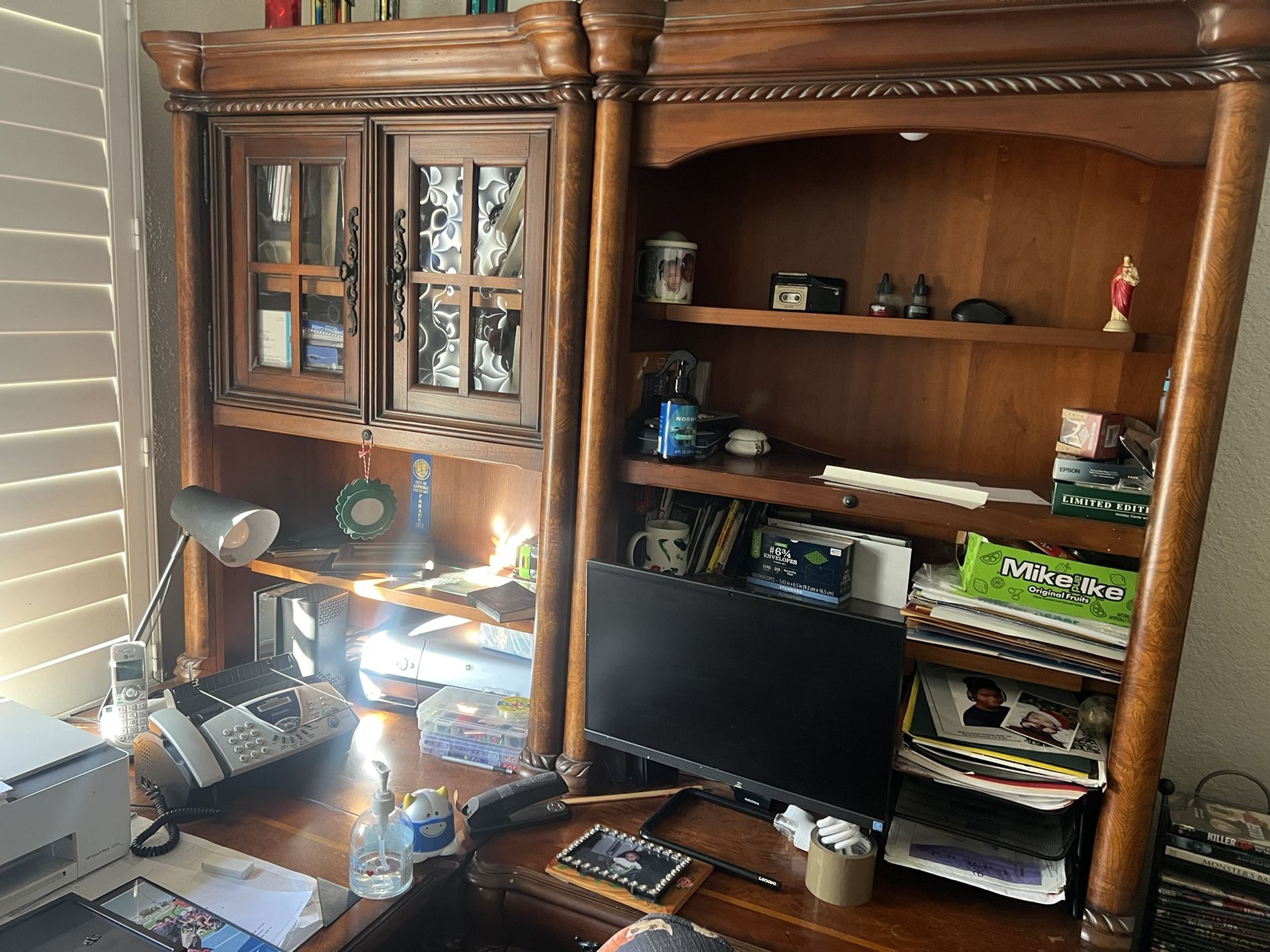 office desk with overhead cabinet