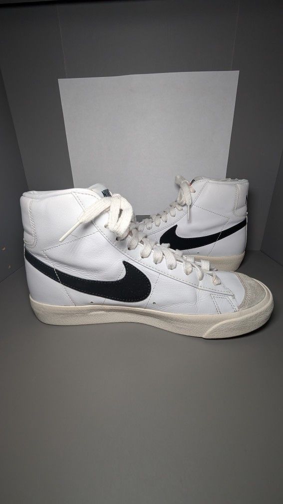 Classic Nike Blazer Mid ’77 sneakers in clean white leather with a bold black swoosh. These retro-style high tops bring timeless Nike vibes with vintage details like exposed foam on the tongue and suede toe overlays. Versatile, comfortable, and always in style. 👟 Details: Men’s US Size 8 Leather upper with suede toe accents High-top design with vintage exposed foam tongue Grippy herringbone outsole Good condition: some light wear on uppers and soles (see photos), tons of life left Cleaned, laced, and ready to rock Great for casual wear, skating, or completing a throwback outfit.