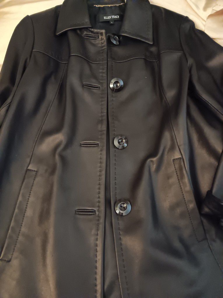 Genuine soft leather heavy women's jacket. Beautifully accent stitching, full roomy pleat in the back, side pockets, lined, buttons down the front. Clean, no flaws, no tags, like new. Well made, nicely detailed warm jacket.