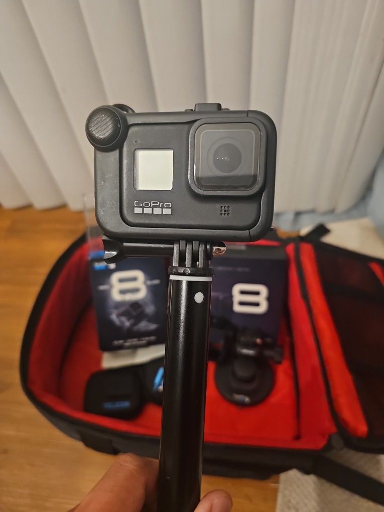 Gopro 8 with media mod and flipping screen. Start your YouTube channel now! Original boxes, suction, telesin case, additional aluminum frame, gopro battery block, battery, selfie stick, tripod, backpack. Used this to vlog my vacations before covid. I've never used it since