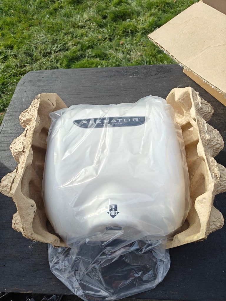 Bathroom hand dryer, brand new in box Dries hands in 8-10 seconds everything still in box