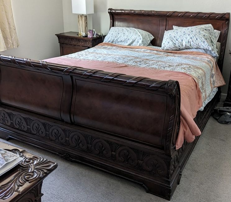 Mahogany King size sleigh bed, dresser and 2 night stands. Comes with box springs and bed rail.