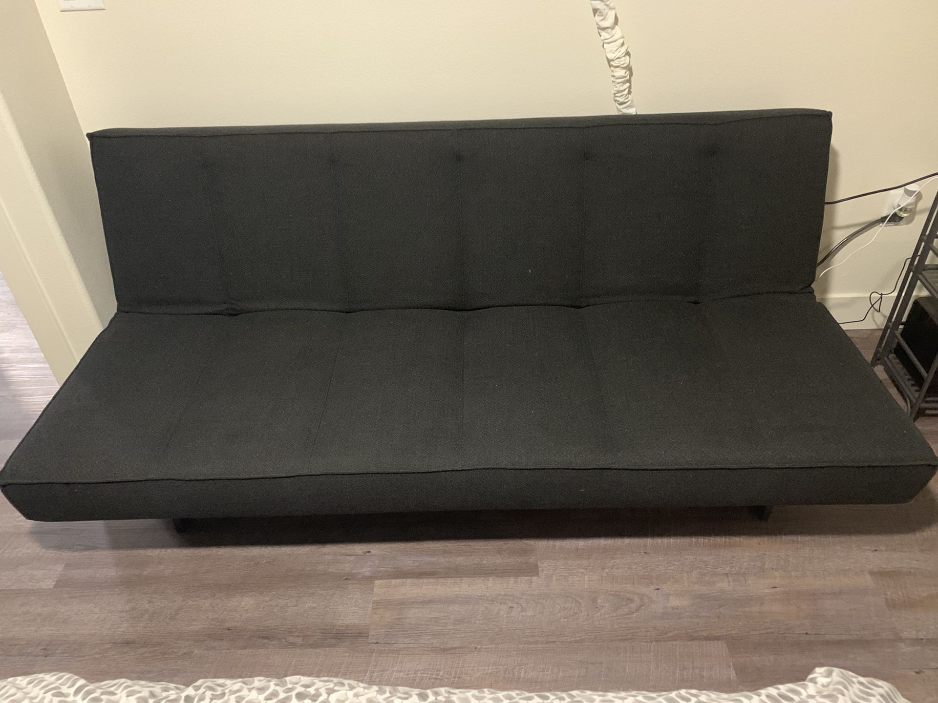 Convertible three-position seater/sleeper. By day it's an upright comfy lounge that can also angle back 45 degrees for TV/reading. As a sleeper the back flips all the way down as a worthy platform bed with real pocketed coil mattress innersprings that sleeps two. Material is a gravel grey textured weave with a baseball topstitch and flange along the edge. Powder coated hand-welded metal and mesh frame; sleek polished chrome base. High-density foam with pocketed coil inner-springs. 100% polyester fabric: gravel grey. Pick up only. Cash or Venmo accepted. Flex Gravel Sleeper Sofa 80"Wx37.5"Dx33.5"H · Three-position back: upright, 45-degree lounge or fully open sleeper for two · Tufted poly fabric: gravel · Tufted cover · Pocketed coil springs with foam cushion · Sleeper position best accommodates a queen fitted sheet