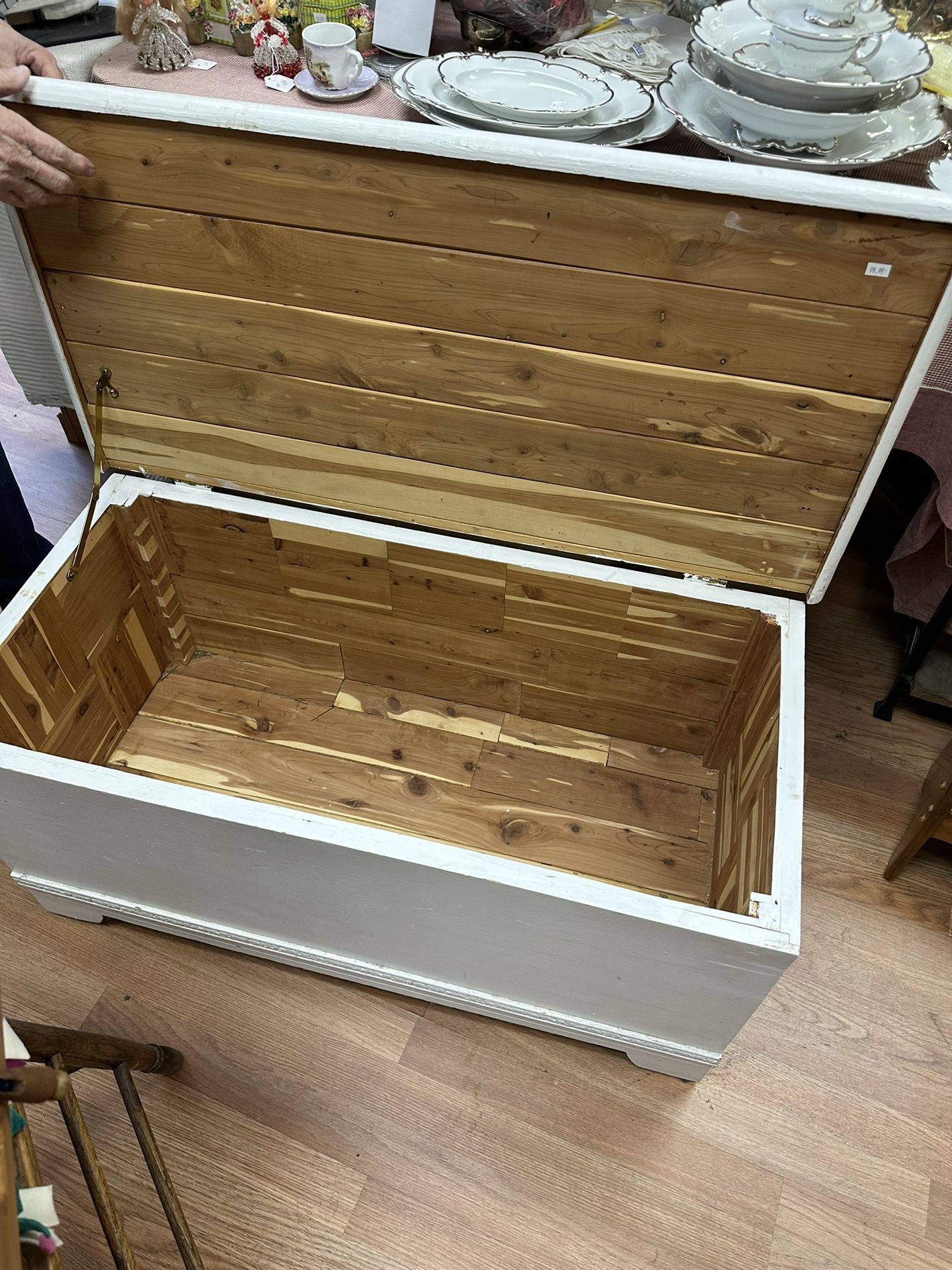 Painted wood chest on rollers. Cedar lined. Used Ok condition. Needs some love. Pick up only