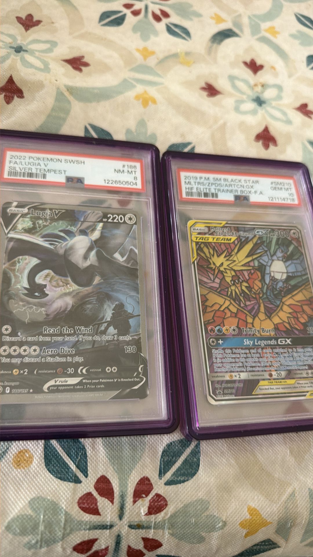 Psa8 lugia 360$ with guard Psa10 moltres glass birds 340$ including guard Trades welcomed Pokemon Yugioh Rc cars