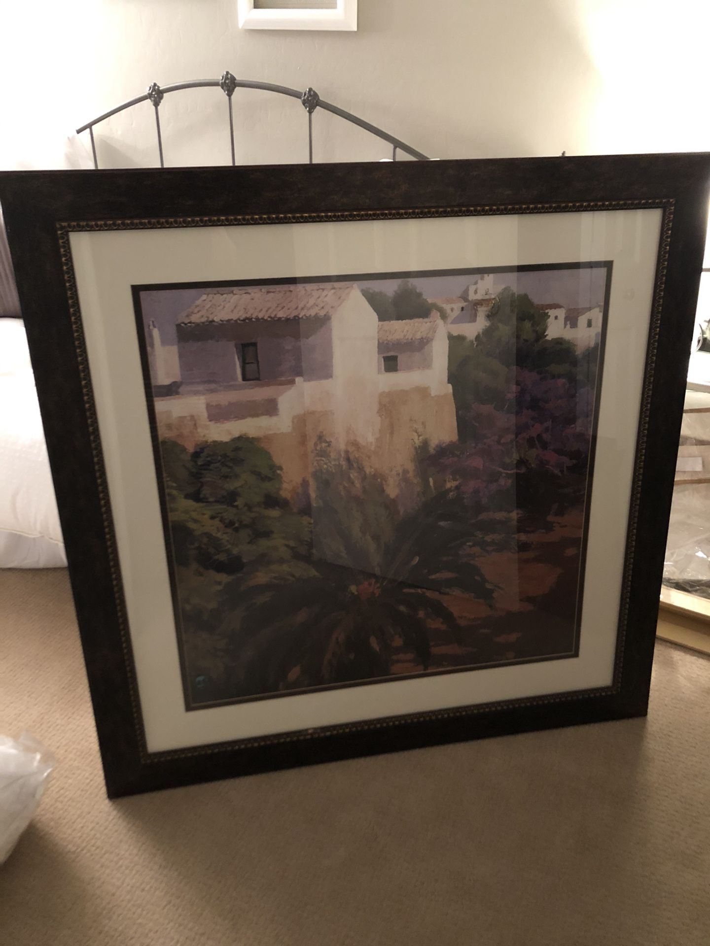 This is the perfect picture for that big open space on your wall! Measuring a large 46.5 in tall x 46.5 in wide and depicts a colorful Tuscan themed village. The frame is a dark wood the makes the colors in this picture pop.