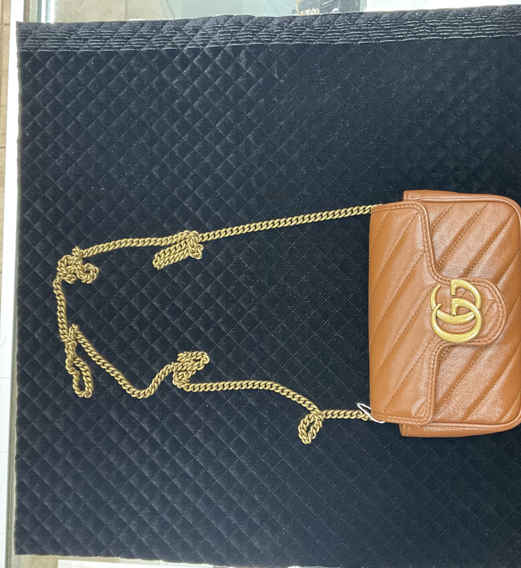 Authentic Gucci GG Marmont Super Mini Bag in a beautiful brown matelassé leather. This compact yet stylish bag features the iconic double G hardware on the front and a versatile chain strap that can be worn crossbody or over the shoulder. Despite its small size, it fits your everyday essentials like a phone, cards, keys, and lip gloss perfectly.