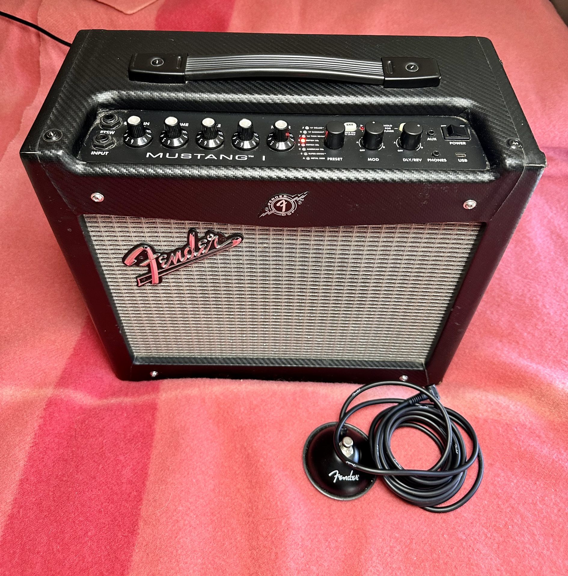 Fender Mustang guitar amp in excellent working condition normal wear and tear sounds great works great. Everything works on it. Comes with brand new fender footpedal.