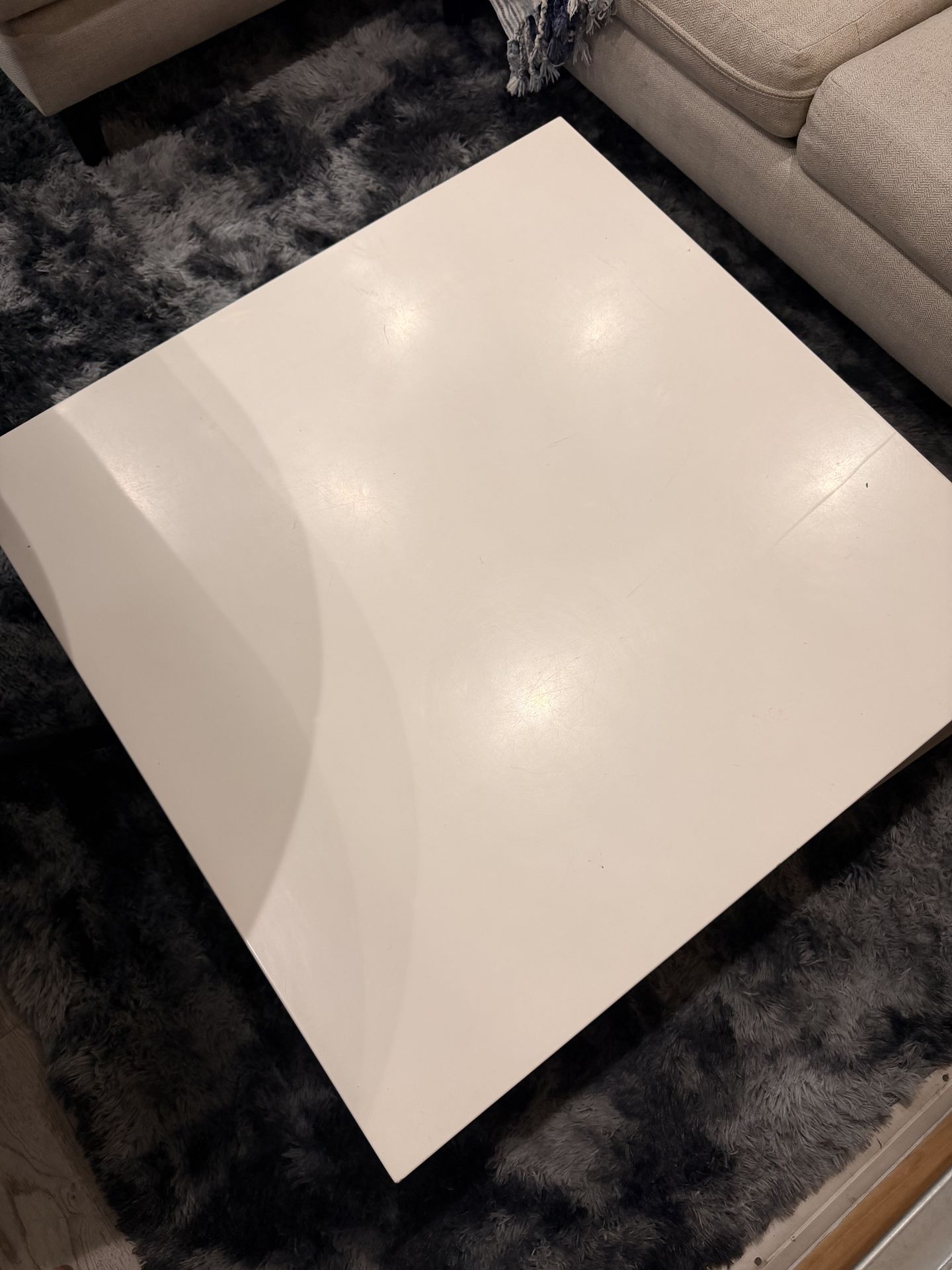 Modern square coffee table with built-in pull-out storage drawers. Clean white glossy finish that looks great in a living room or lounge area. Very sturdy and functional with hidden storage to keep remotes, chargers, and small items organized. Good condition with minor surface wear from normal use. Perfect for modern or minimalist home setups. Dimensions: Approx square coffee table size. Pickup only.